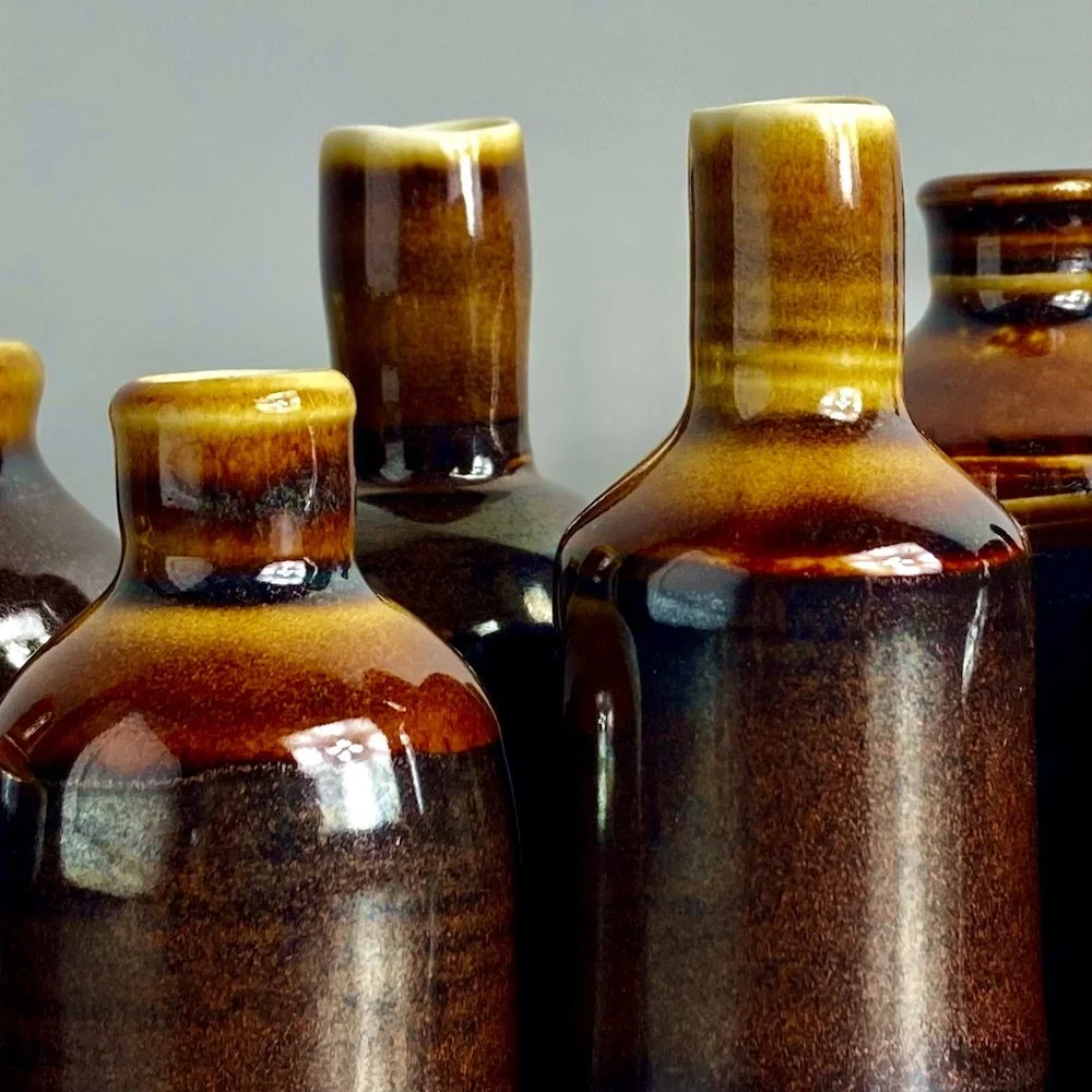 They are glazed with multiple high fired glazes making each piece both functional and unique.The rich tenmoku style dark glaze is often used with a honey glaze to create translucent layers across the forms.This is often contrasted with a celadon style glaze on the interiors.