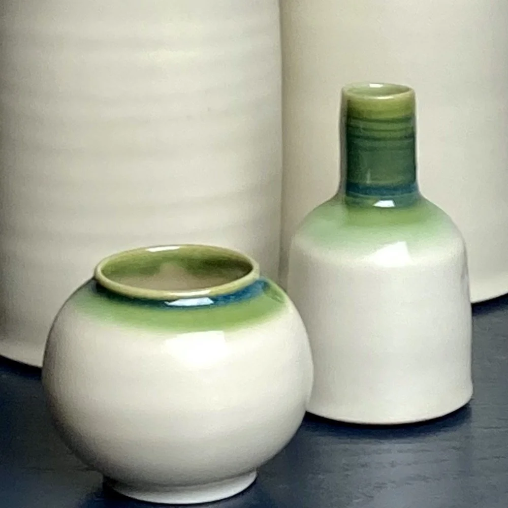 Having spent many years making large scale terracotta at his studio in Hay Simon is now enjoying the technical challenges of potting on a much smaller scale using a very fine bodied porcelain. All the work , bottles, cups, beakers and jars are thrown on the potters wheel and often turned when leather hard to refine the shapes.